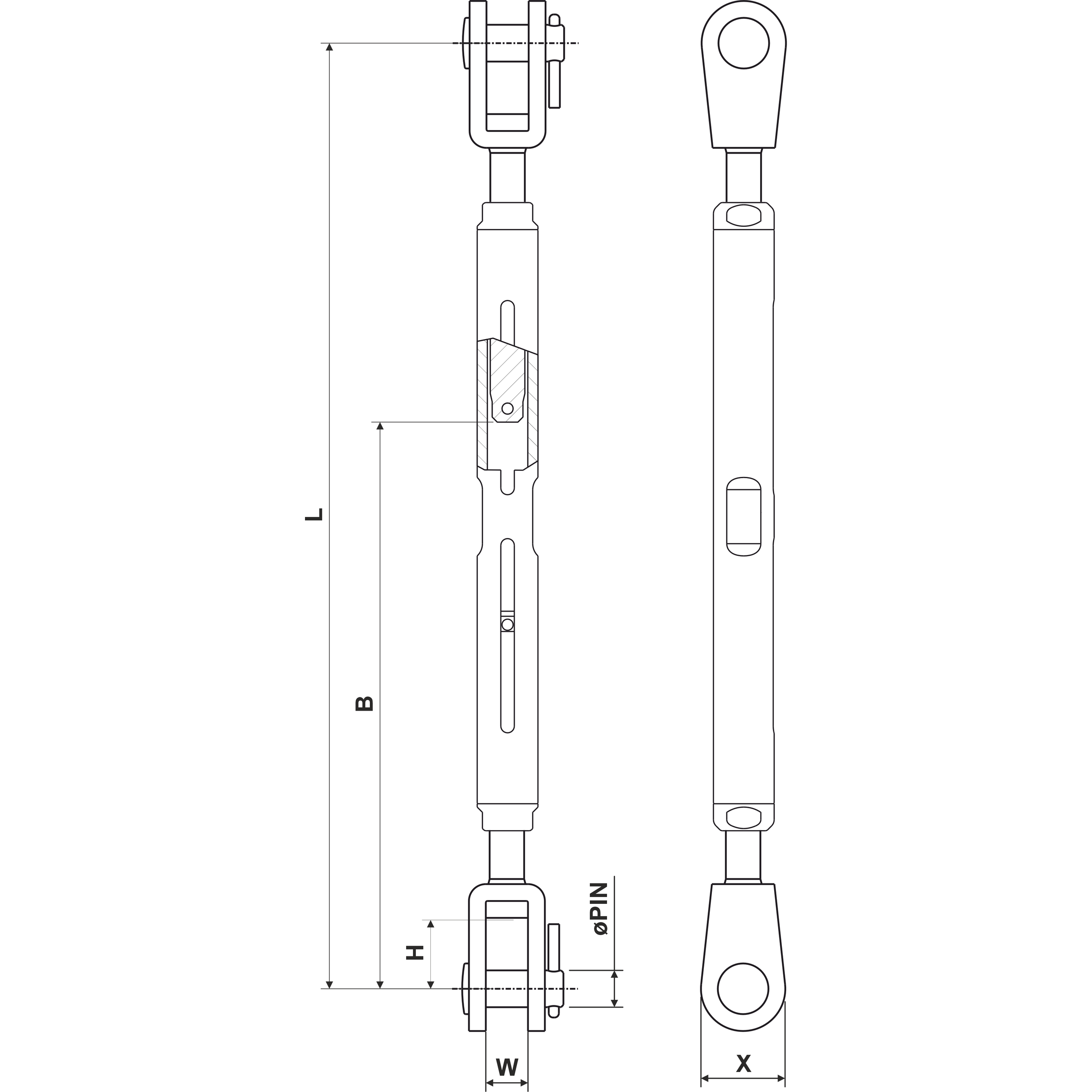 Turnbuckle - StB - Stainless body with bronze thread, Stainless Terminals, 1", Fork/Fork, ø25,4 mm Clevis Pin