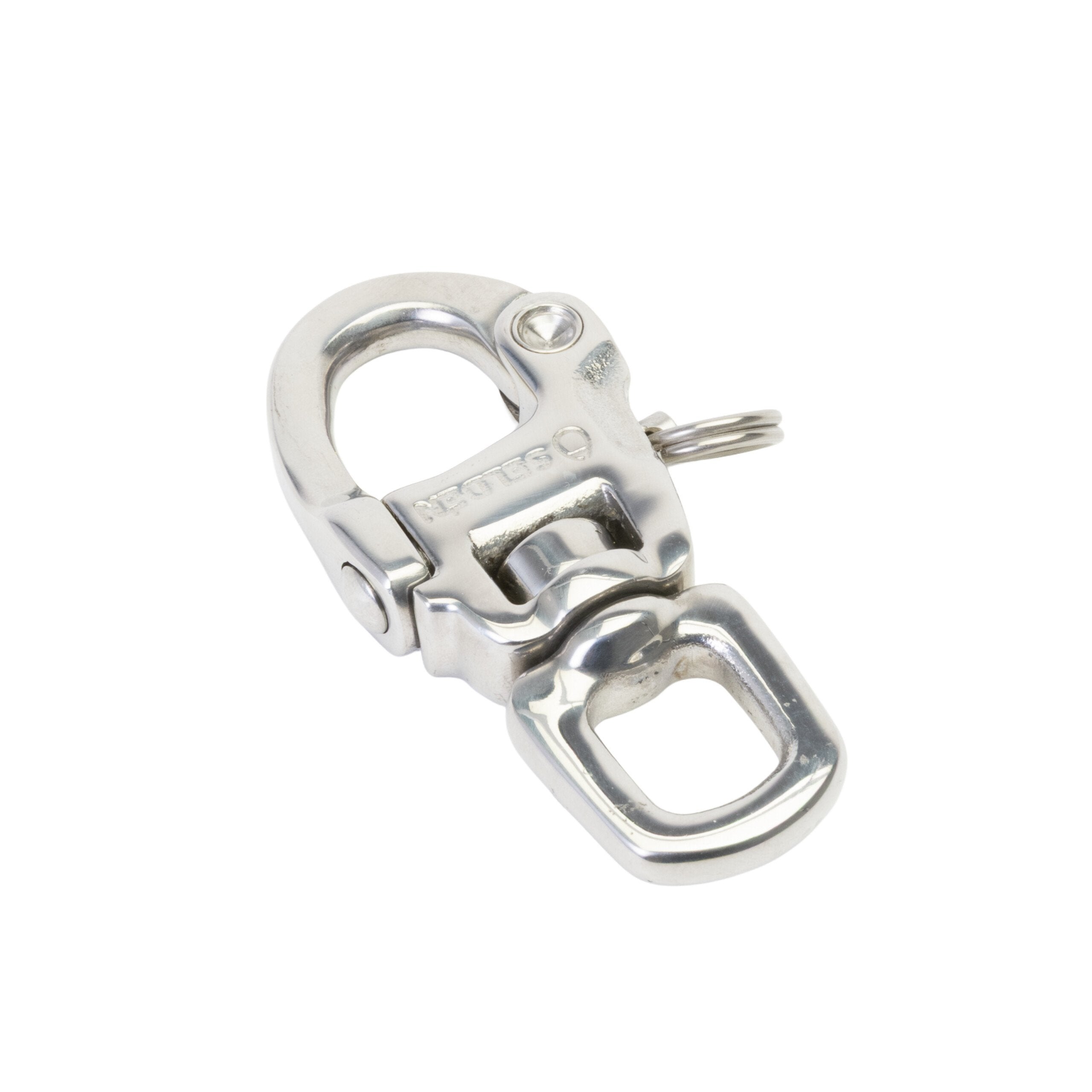 A swivelling snap- shackle made of high strength Duplex 2205 stainless steel for optimized weight in relation to work load. High gloss mirror finish.
